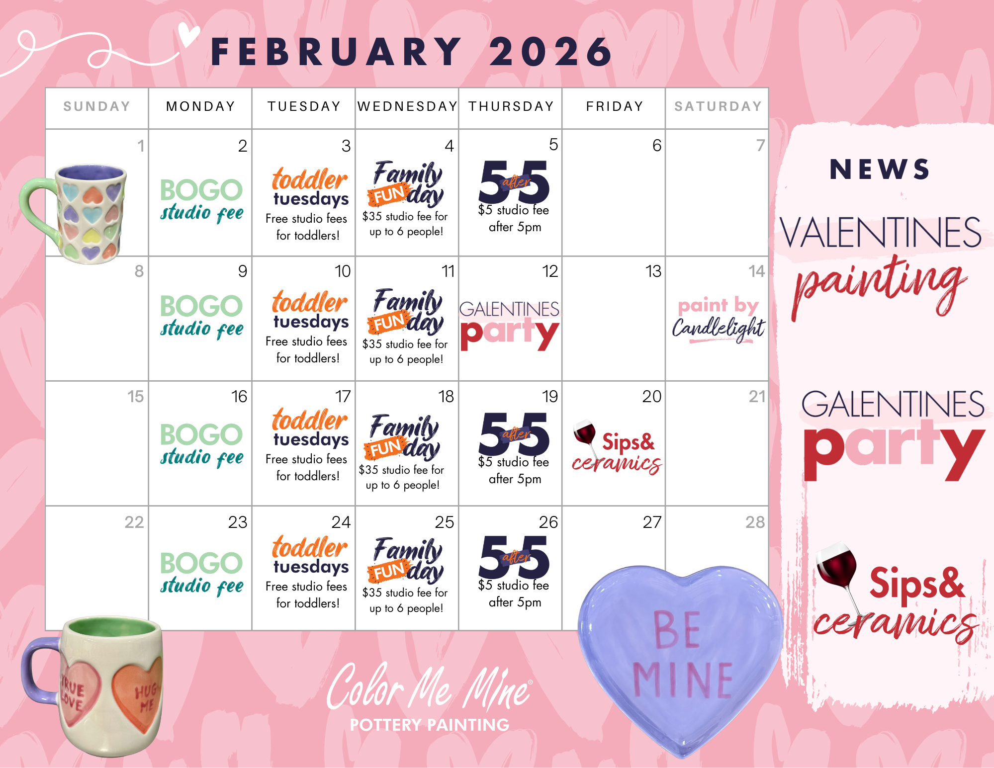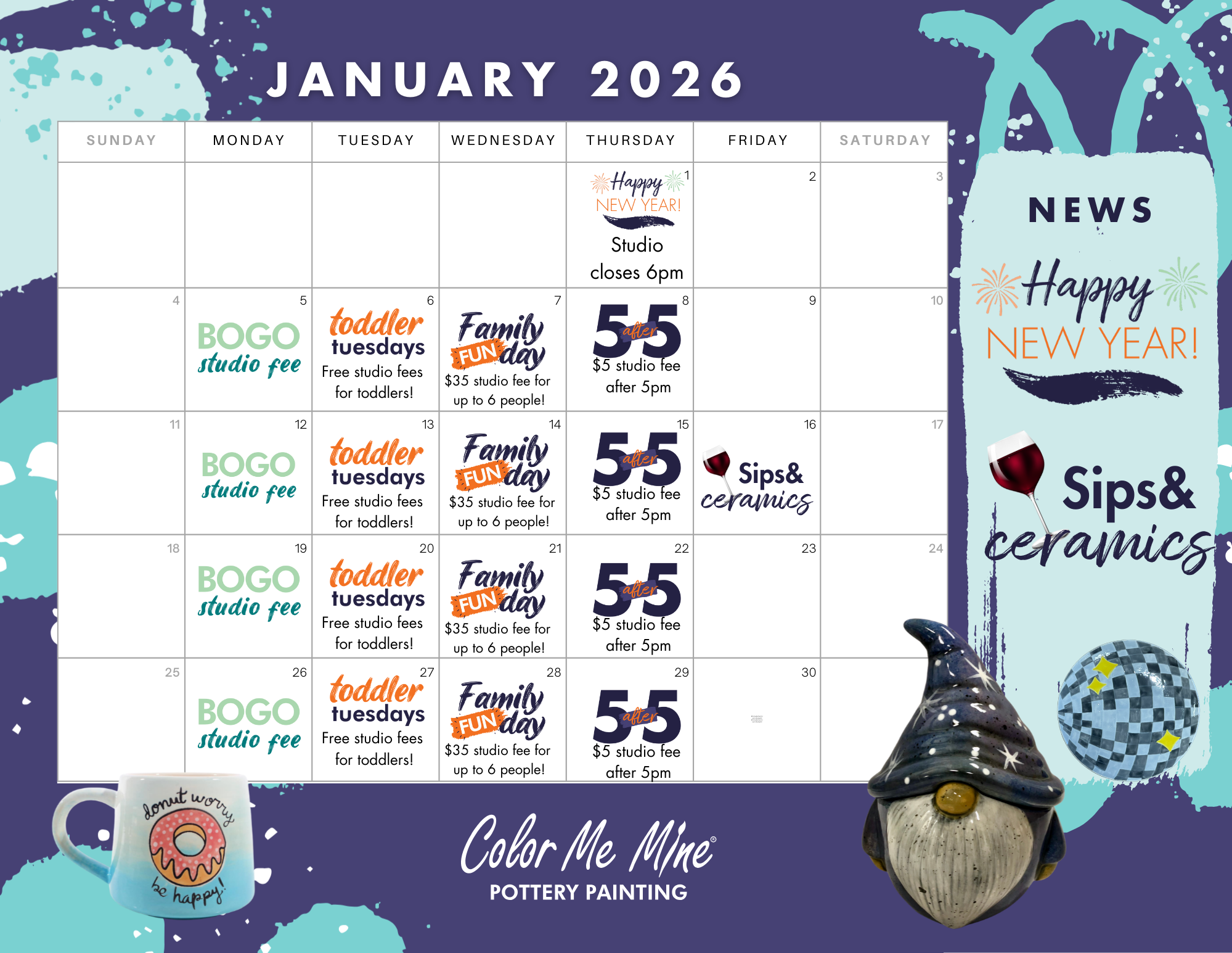 Check out our daily specials and save! Two for one studio fees every Monday. Free studio fees for kids 5 and under on Tuesdays. Family Fun Day - $25 studio fee for up to 6 painters on Wednesdays. On Thursdays studio fees are only $5 after 5pm.